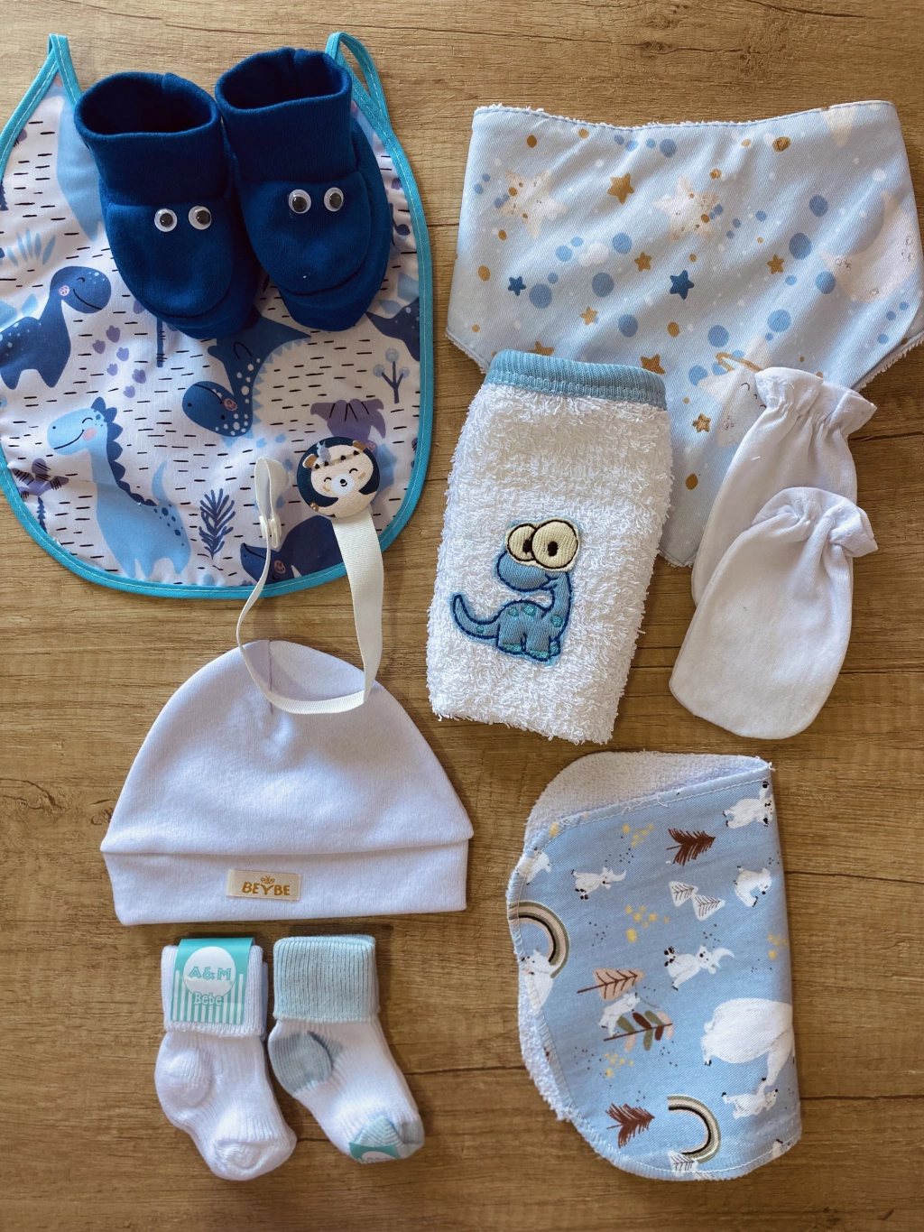 1 Gorrito, 1 bandana, 2 pares de medias, 2 babitas, 1 baberos, 1 portachupete, 1 par de escarpines, extensor de body o 1 par de manoplas. Todos para recién nacidos en cajita o bolsita de regalo y detalles que lo hacen un presente único.